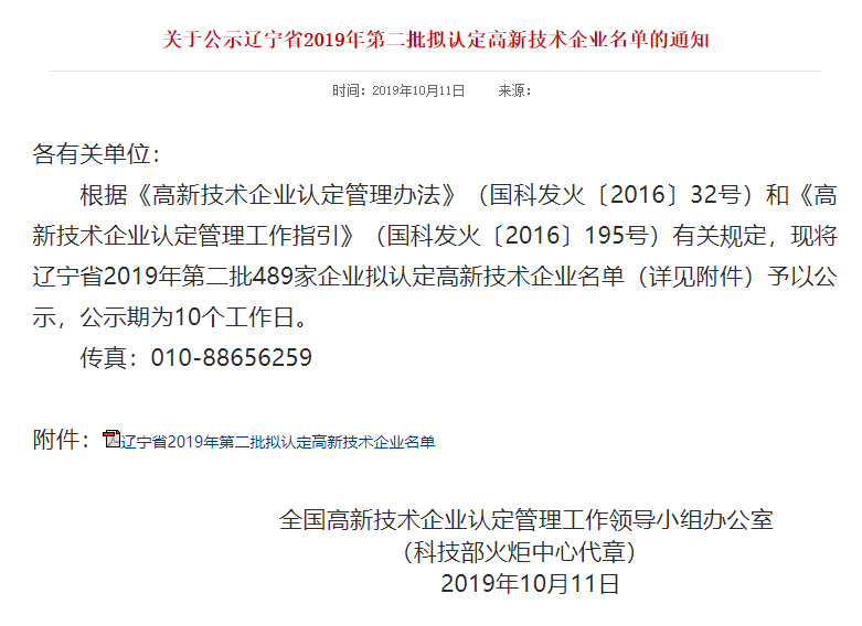 我公司進入遼寧省第二批擬認定高新技術企業(yè)名單